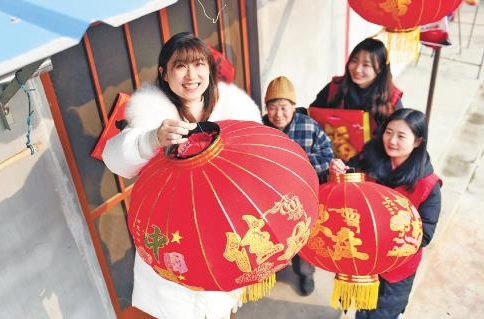 春節(jié)臨近,郯城縣婦聯(lián)開展“送文化年貨迎新春”惠民暖心活動,巾幗志愿者深入鄉(xiāng)村、農(nóng)家,為貧困家庭送來寫有頌黨愛國、家風(fēng)家訓(xùn)等內(nèi)容的春聯(lián)以及福字、紅燈籠。圖為1月17日,巾幗志愿者為馬頭鎮(zhèn)梁村的秦云芳老人送來“文化年貨”并幫其布置庭院。