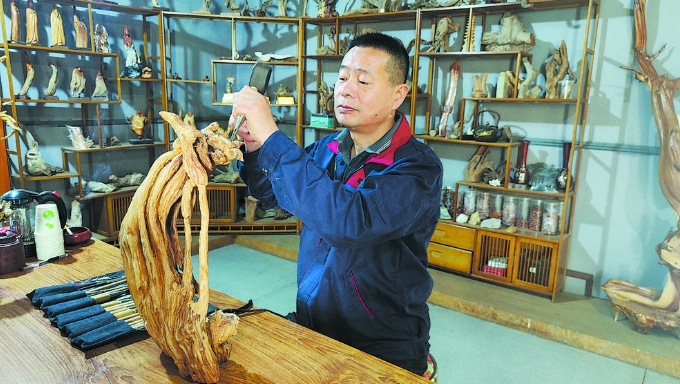 一段樹根、一截枯木,經(jīng)過根雕藝人的精雕細(xì)刻、耐心打磨后,就能重新煥發(fā)出新的生機(jī)。“化腐朽為神奇”,變身精美的藝術(shù)品,便是根雕的本質(zhì)。