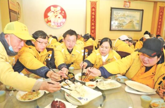 12月22日,青島豐利家常菜館邀請(qǐng)轄區(qū)60多名環(huán)衛(wèi)工人免費(fèi)吃餃子。這是愛(ài)心企業(yè)青島市豐利餐飲公司第11年在冬至?xí)r節(jié)請(qǐng)環(huán)衛(wèi)工人免費(fèi)吃餃子。